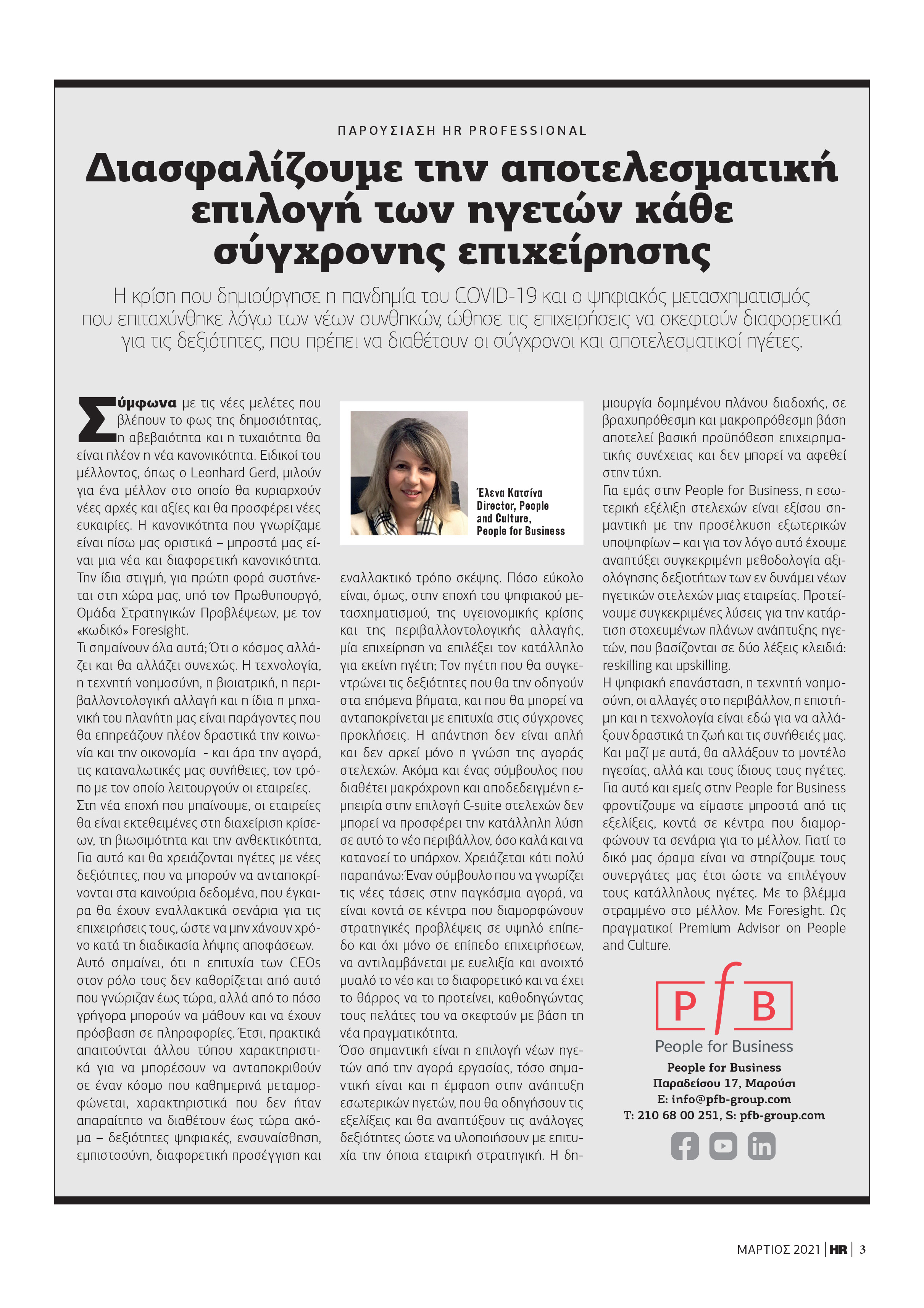 Ενα πολύ ενδιαφέρον άρθρο από την Ελενα Κατσίνα για το πώς η People for Business -με το βλέμμα στραμμένο στο μέλλον- διασφαλίζει την αποτελεσματική επιλογή των ηγετών κάθε σύγχρονης επιχείρησης, δημοσιεύτηκε στο περιοδικό HR Professional, του Μαρτίου.