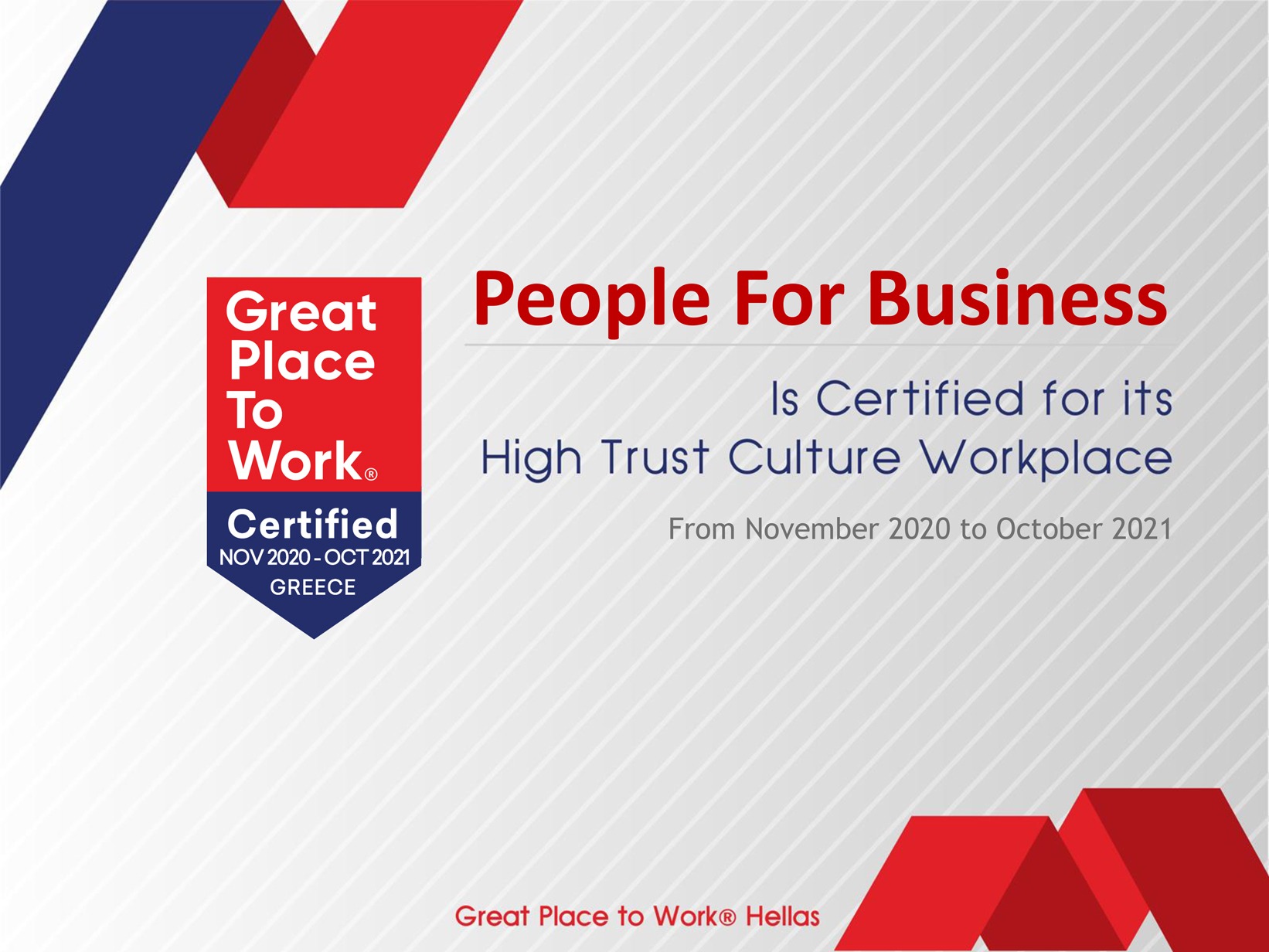 Η People for Business απέκτησε την Πιστοποίηση του Great Place to Work®, (CERTIFIED by Great Place to Work®) μετά από μια μεθοδική και διεξοδική αξιολόγηση